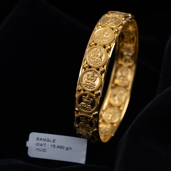The Sriya Bangle is a timeless piece that reflects the blessings of Goddess Lakshmi, the harbinger of fortune and abundance. Featuring intricately embossed motifs of the Devi, this traditional coin-style bangle captures the essence of spirituality and heritage. Crafted in radiant gold, its exquisite detailing makes it an auspicious choice for weddings, festive occasions, and treasured heirloom collections. The Sriya Bangle is more than jewelry—it is a symbol of prosperity, devotion, and eternal elegance.